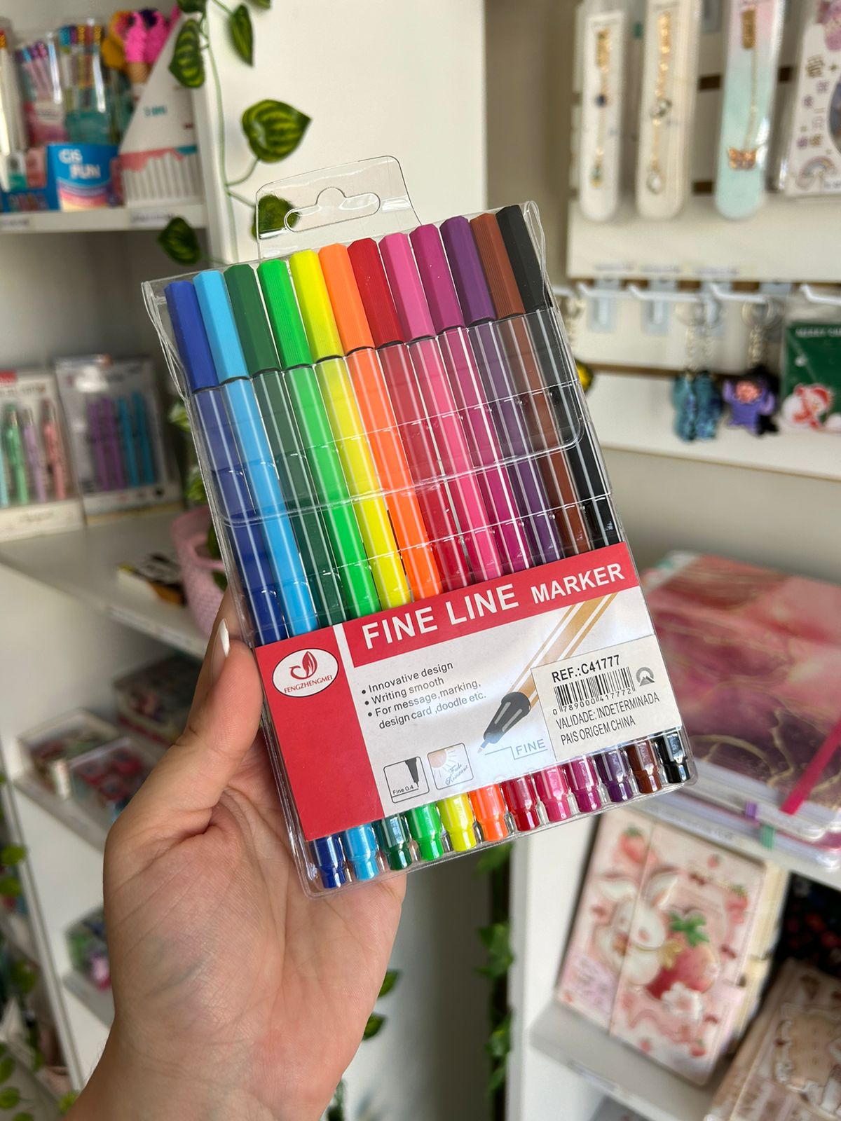 O Kit de canetas mais completo para você vender em sua papelaria. Esse kit possui canetas Fine 0.4mm, super parecidas com as canetas da marca Stabilo. A pontinha de Feltro facilita a transmissão da tinta deixando a marcação fininha e pigmentada. São 12 Cores em cada Kit para formar aquela coleção e carregar para vida. Cada Tampa mostra a cor da caneta.