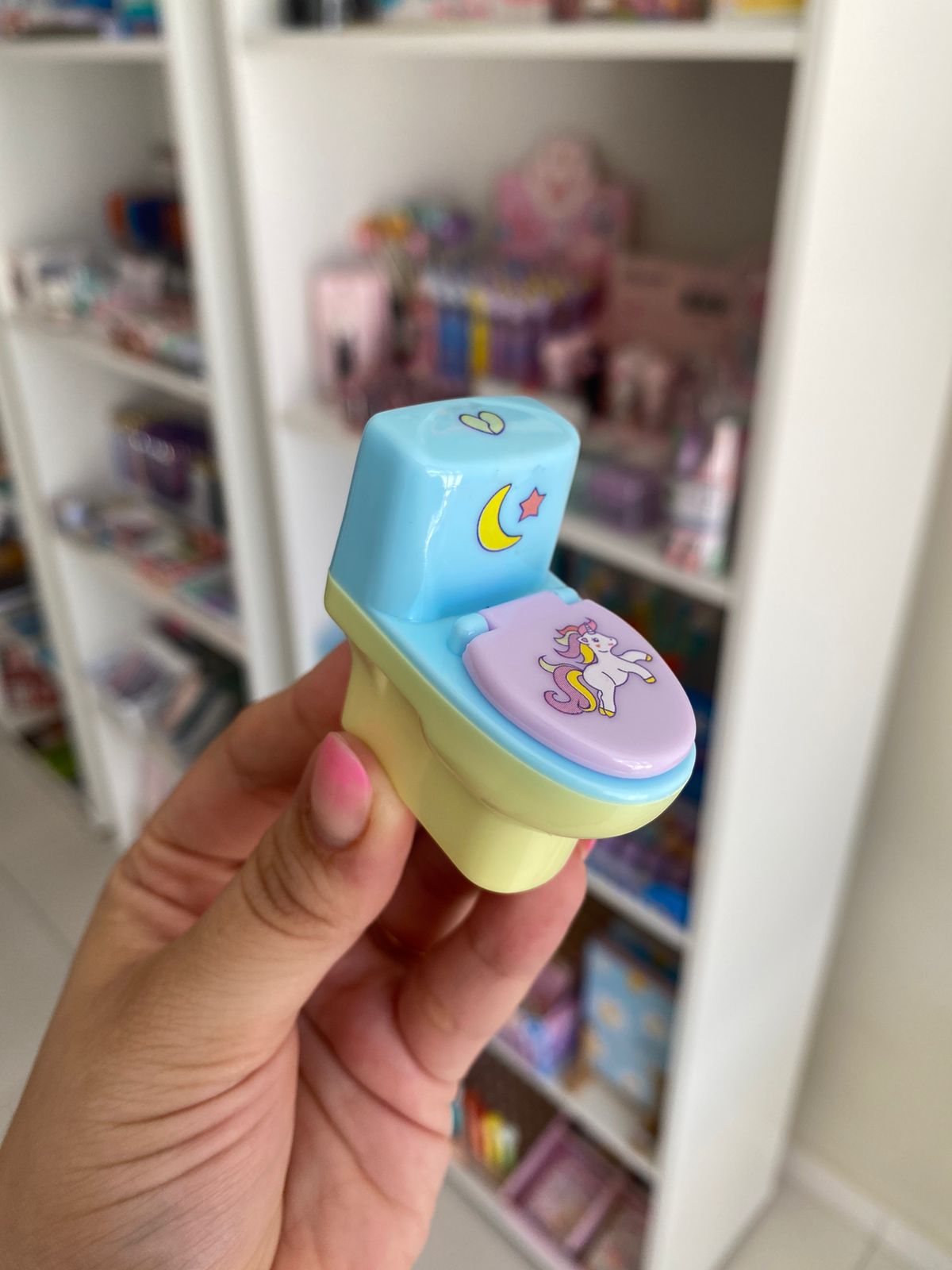 Um apontador mais do que diferente e lindo! O apontador em formato de privada possui depósito para armazenar o lixinho após apontar os lápis e ainda acompanha uma mini borracha de unicórnio na parte de dentro da tampa :)