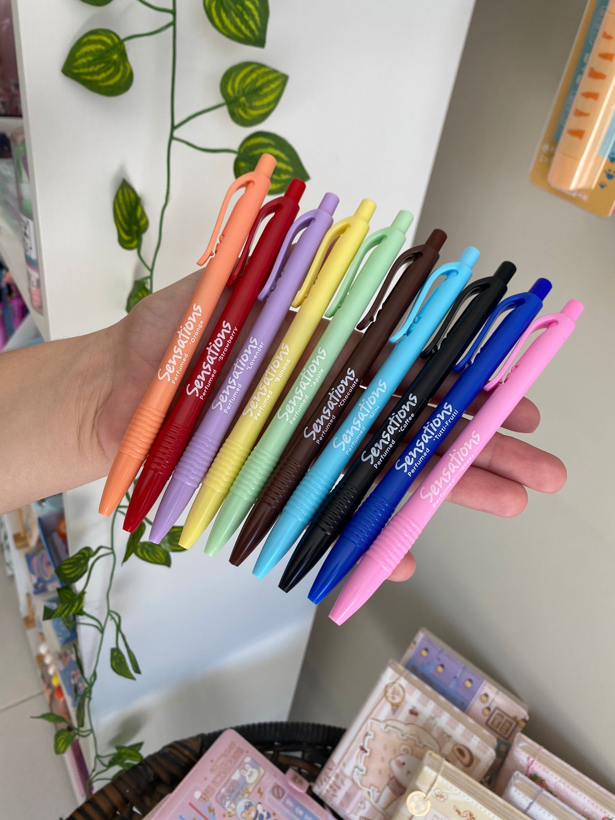 Caneta com cheirinho? Sim! A Newpen tem e a escrita é delicada e macia. Possui escrita fina de 0.7 mm, 10 cores e cheiros diferentes que fixam no papel . Sua tinta é ultra deslizante, além disso, ela é retrátil, o que conserva a sua ponta.
