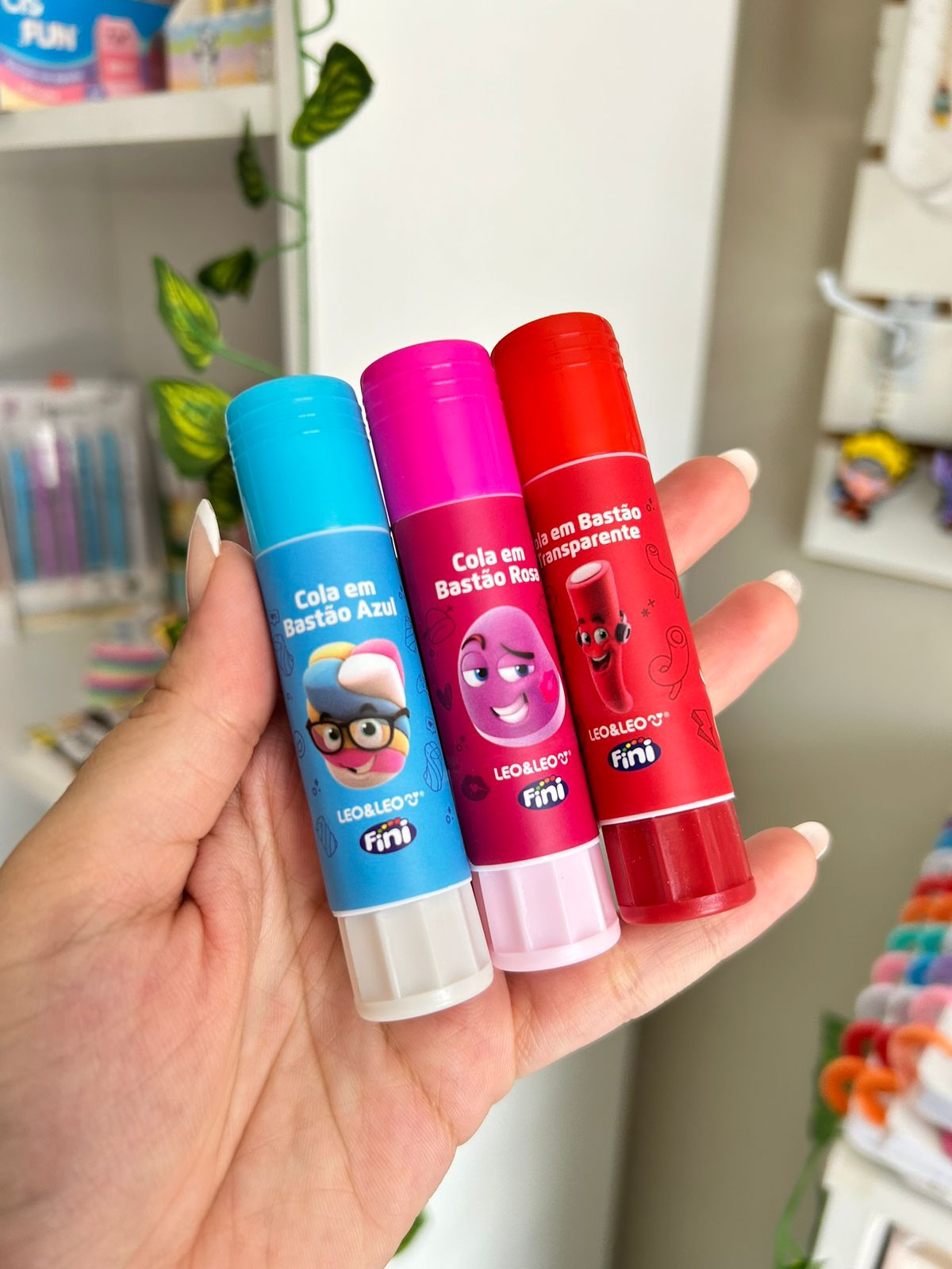 Além de vir com exclusiva estampa da FINI com seus divertidos personagens, a cola bastão apresenta cola colorida com mecanismo de rosquear no seu corpo. São 3 personagens diferentes, em 3 cores variadas no corpo: azul, vermelho e rosa.