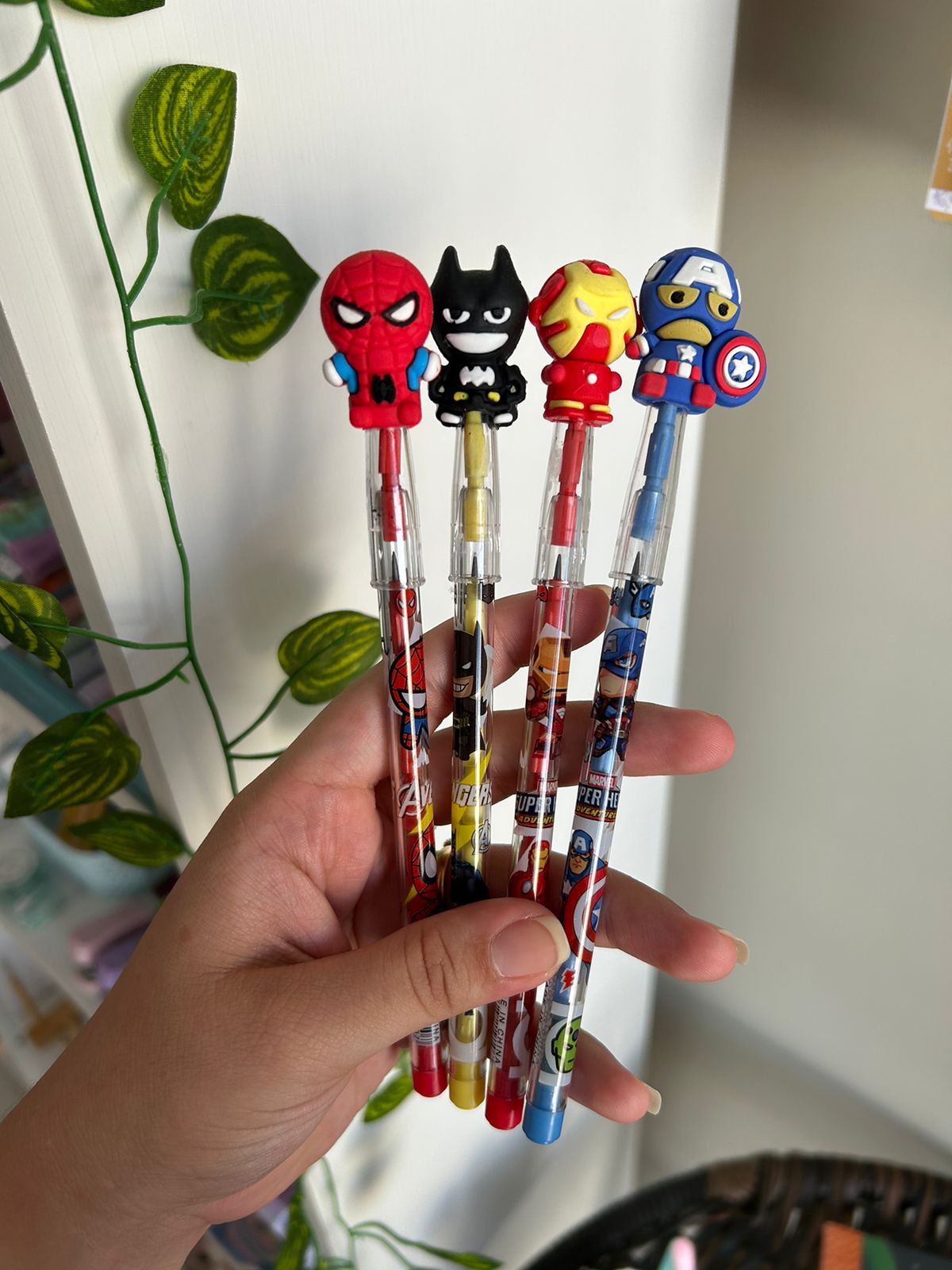 Lapiseira divertida de super heróis São 04 (quatro) modelos para você escolher: Batman, Capitão América, Homem de Ferro e Homem Aranha. Contém 11 pontas em cada lapiseira