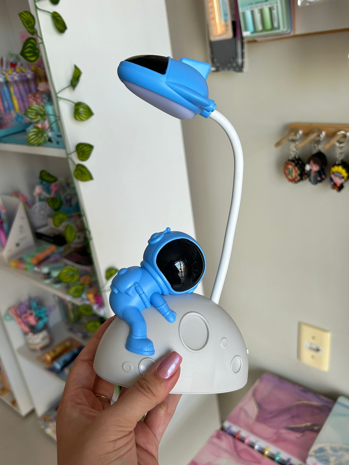 Luminária de mesa no modelo Astronauta segurando a lua. Super fofo e perfeito para enfeitar e colocar no quarto. Possui 2 iluminações - 1 no Capacete do Astronauta e outra em cima, no Foguete. Possui haste flexível para ajustar altura e direção da luz. Acompanha cabo USB para recarregar.