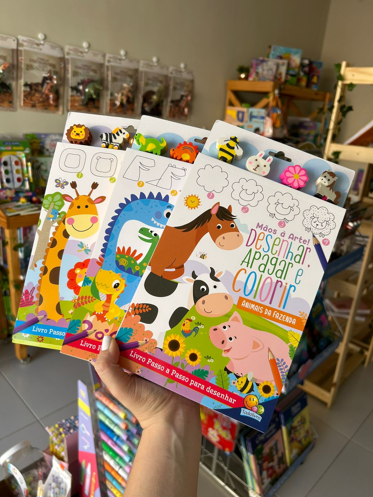 Acompanha 4 lápis de cor com 4 borrachas ilustradas e temáticas!