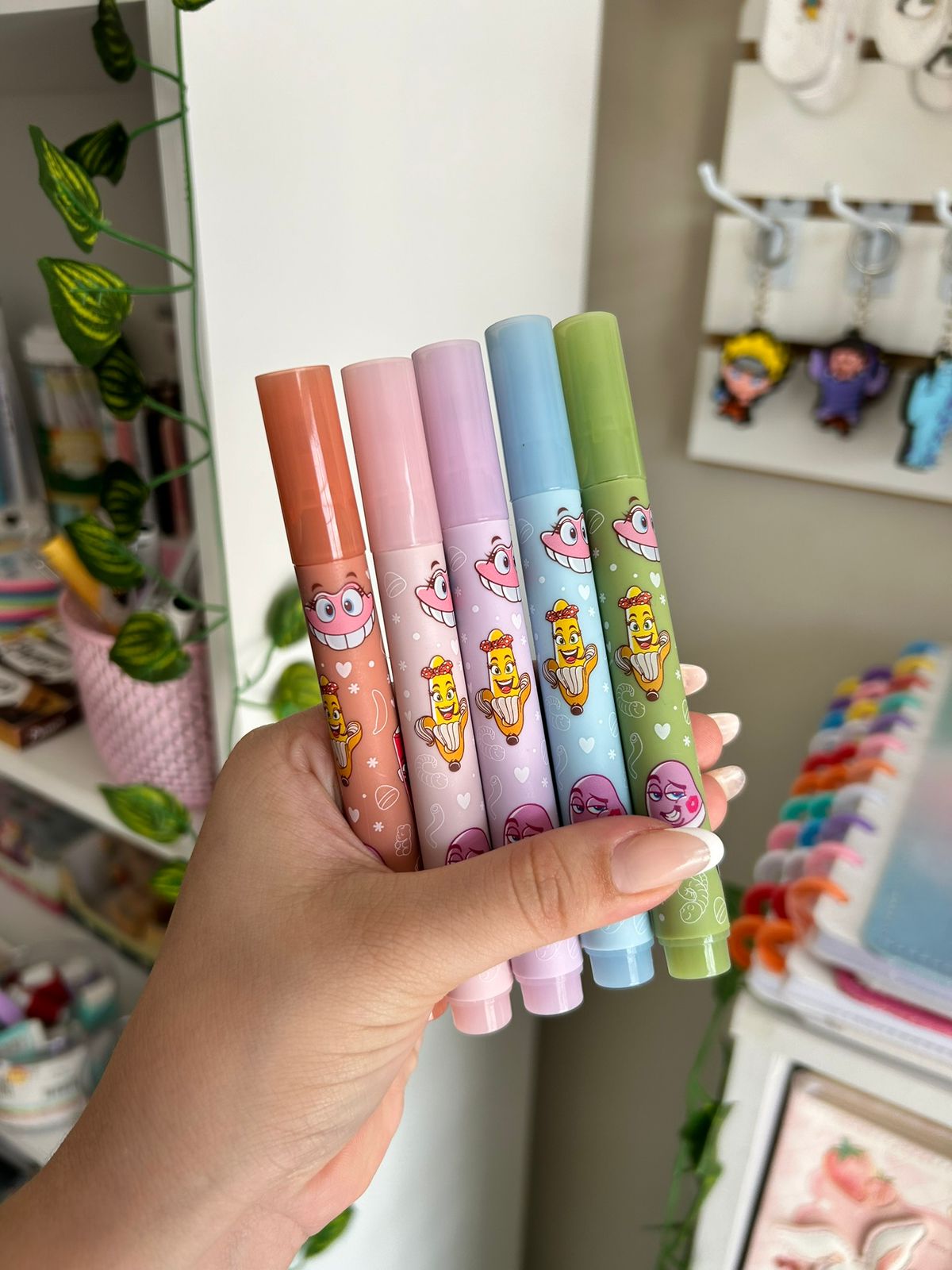Atóxico, o Marca-Texto Corpo Estampado com Aroma Fini vem no blister com 5 unidades, com ilustrações dos personagens Fini em seu corpo, deixando qualquer marcação de texto muito mais divertida e perfumada.