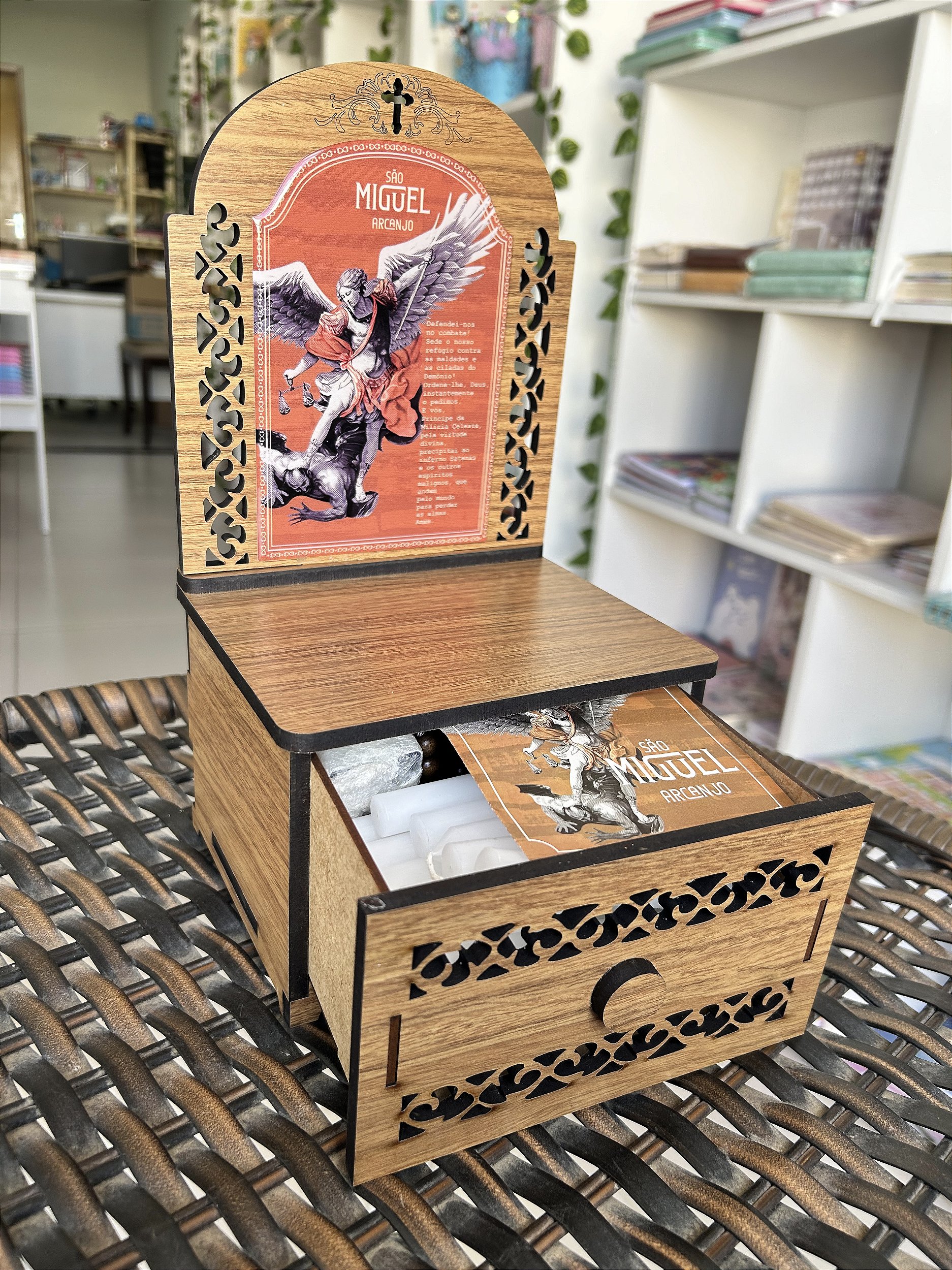 A Loja Canção Nova apresenta o Oratório Quaresma São Miguel, feito em MDF, com acabamento em resina, na cor mogno, e mede 20x15cm.