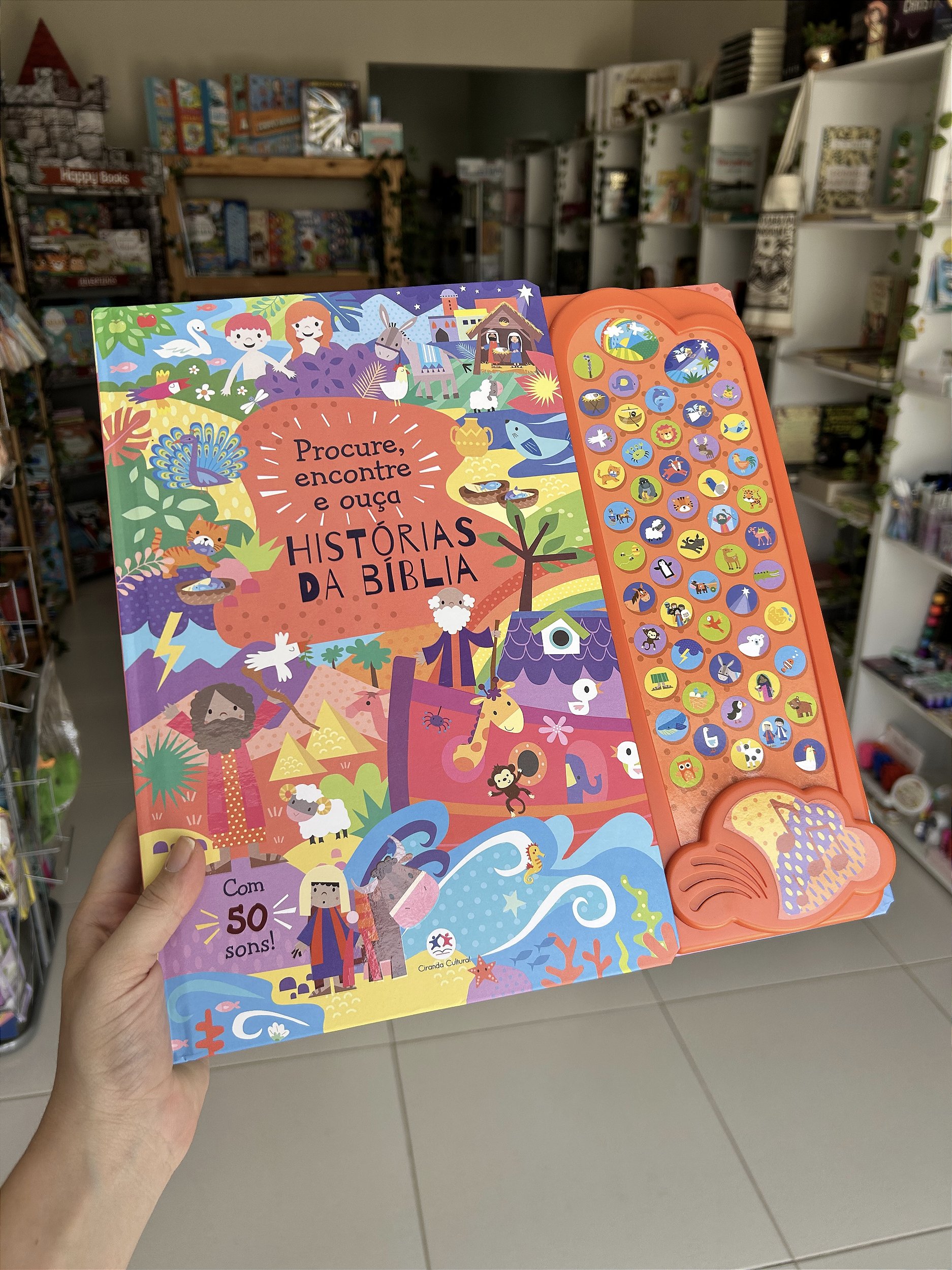 Procure e encontre muitas imagens de histórias da Bíblia e ouça mais de 50 sons neste livro divertido. E não se preocupe: se a bateria acabar, é só trocar e a diversão continua sem parar!